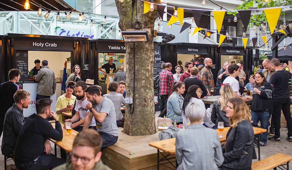 All over the world, the potential of redundant urban space is being tapped into; to make our cities better places to be. A lot of this centres around sustainability and the creation of health-enhancing green space. New Yorkβs High Line, a former elevated railway-line that has been turned into a park with fantastic views of the city is the perfect example, but other exciting space-optimising innovations include vertical forests, on the side of high-rise buildings, urban farms on restaurant and apartment block rooftops and βpocket parksβ on vacant building lots. We started our own journey in this space by transforming some of the amazing rooftops on our buildings to create stunning gardens for our customers to work, collaborate with colleagues and relax on. These include Blackfriars House and Neo in Manchester, Lancastrian in Trafford and most recently Platform in Leeds. Savvy space invaders are having a big impact. And it goes far beyond simply boosting urban green credentials. Under-utilised space is being harnessed to bring a plethora of benefits and new experiences to city dwellers. At Bruntwood, weβre using previously overlooked spaces to help gel communities together, provide attractive new amenity and drive economic prosperity. Sounds like a tall order? Well, Hatch, our food, drink and retail destination on Oxford Road next to Circle Square is already delivering on all of these fronts. An ever-changing, shipping container pop-up scheme, Hatch has breathed new life into what was an underused space under the Mancunian Way flyover at the top of Oxford Road.